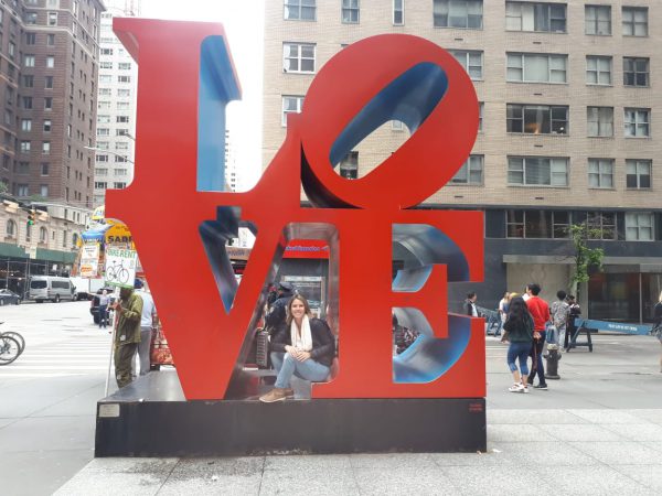 Inés en la esquina con la calle 55, está una de las esculturas más fotografiadas de la ciudad, las letras rojas de Robert Indiana que forman la palabra ‘LOVE’.